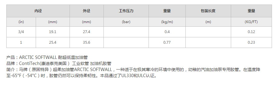 用途:一種適于在寒冷的環境中使用的,幼稚的汽油加油泵專用膠管。在溫度降到-65°F(-54°C)時,膠管仍然可以保持柔韌性。