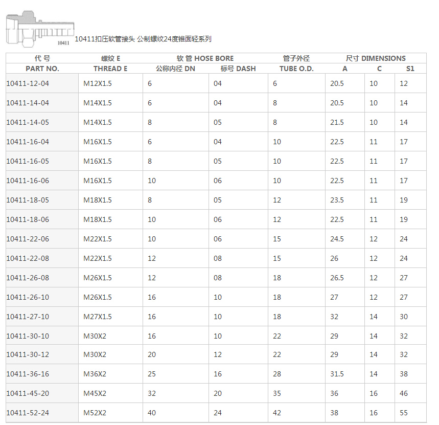 10411公制外螺紋24°內(nèi)錐輕系列